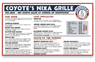 Family owned and operated, Coyote’s Nixa Grill is a place you can call home. As a member of this community, we treat everyone like family offering a great place to relax, eat good food and have fun.